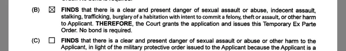 The court-ordered Emergency Protective Order, granted by a Texas Criminal Court.